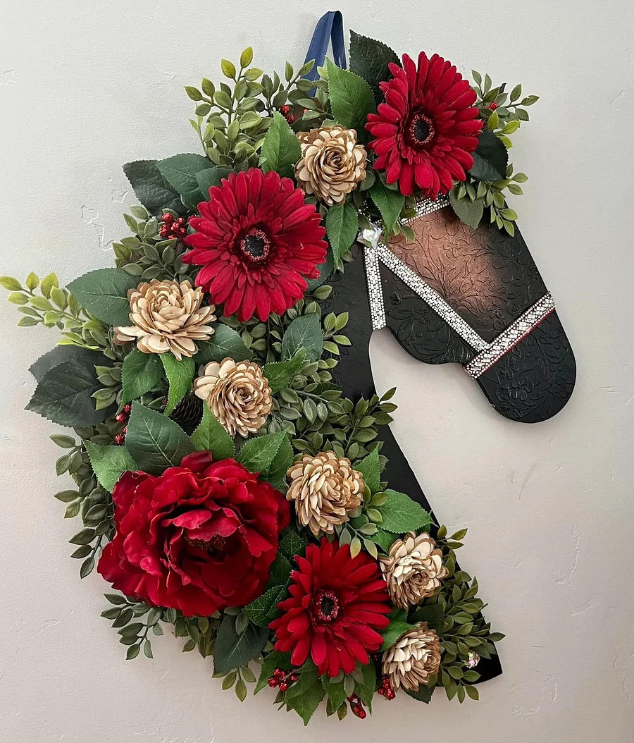 🐴A beautiful way to invite your friends and family into your equestrian home! 😍 Artistic wooden horse head door hanging decorated with beautiful artificial flowers. The flowers are painted with glittering paint, the horse has an embossed look, and the wood has an artistic pattern on top.