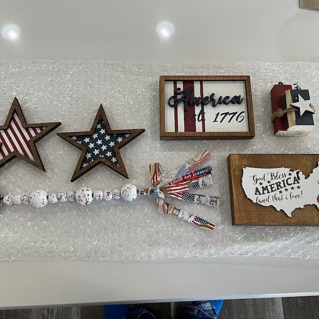 Adorable American tiered tray decor set! This set includes 6 pieces!! They each would look cute on their own or displayed together on a tiered tray. The Tiered tray Bundle will be a great addition to any 4th of July decor for gatherings.