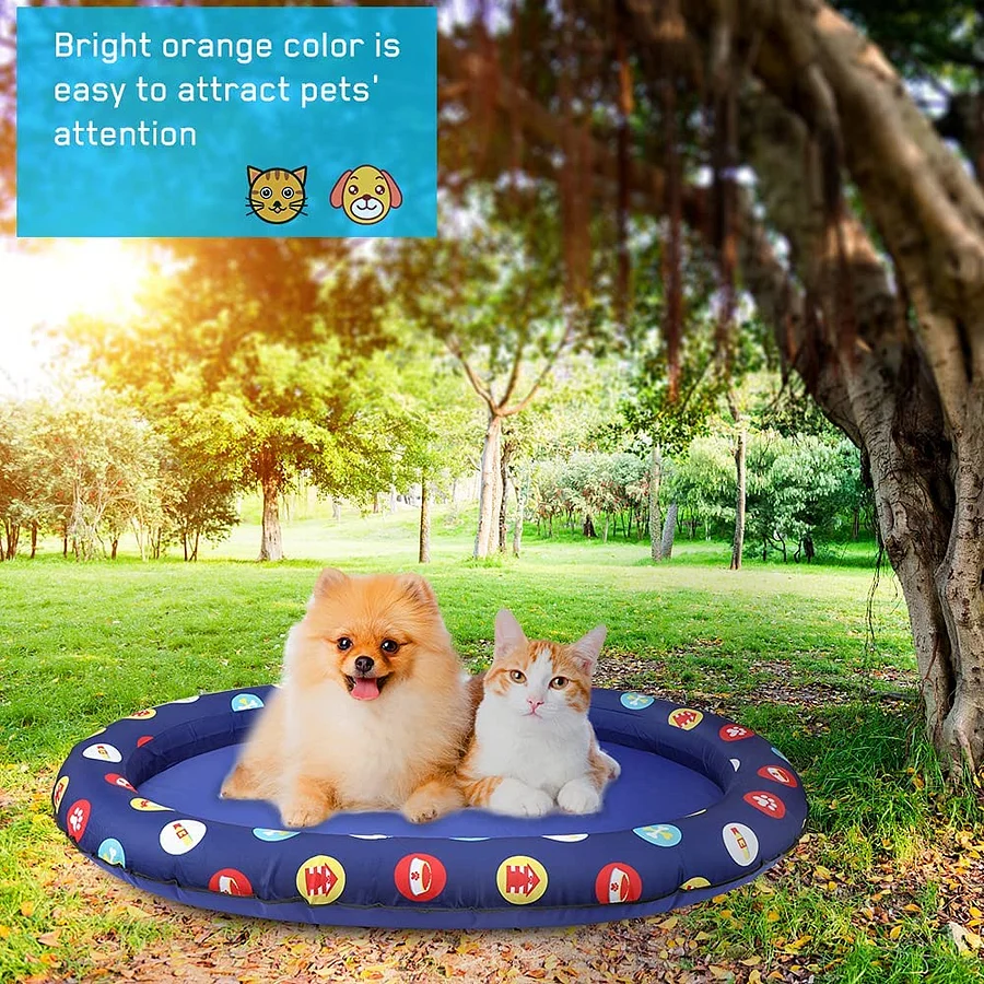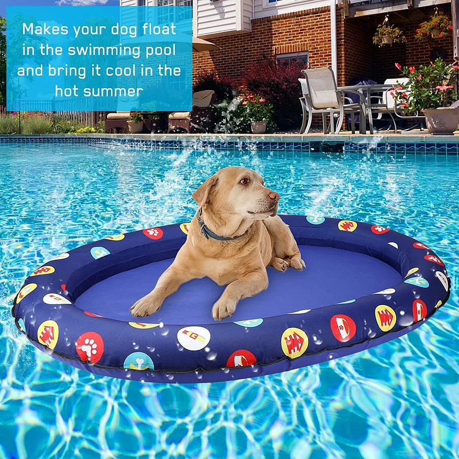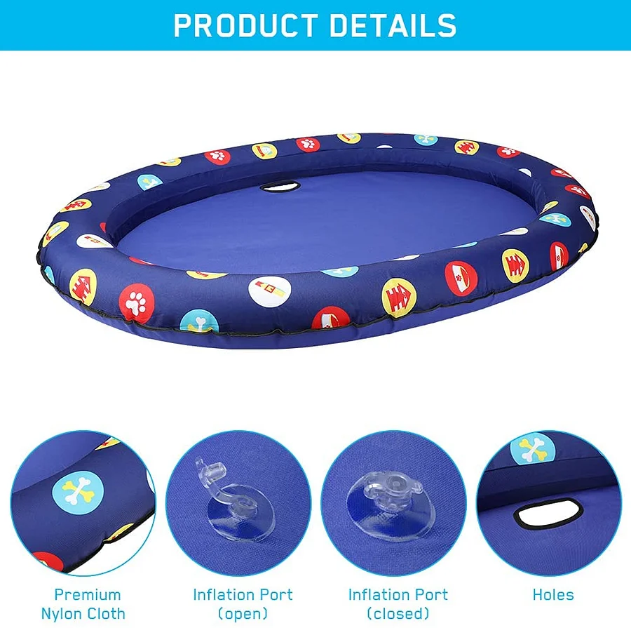 Pet inflatable float allows dog to float on the water to enjoy the coolness, helping it drive away the hot summer, suitable for outdoor or indoor pools, ponds, lakes. Adopts high-quality oxford cloth and PVC, it has good tear resistance and long-time, can withstand dogs and cats under 30kg.