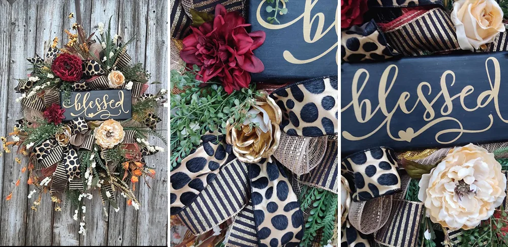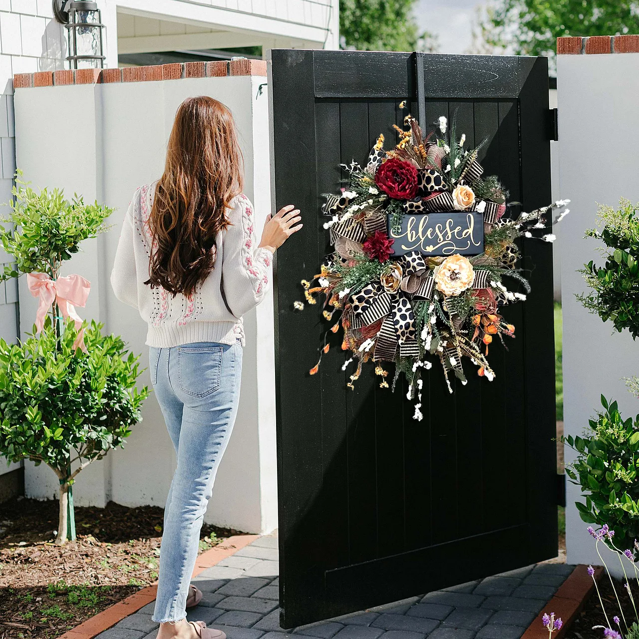 Unique charm:🌺This is an elegant traditional wreath, perfect for the entire season. The sign is custom made by a talented artisan.It has beautiful foliage nestled in the hydrangeas and lovely deep red florals.🍂🍁Double bows in gold and black. Cheetah is a plus.
