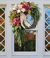 Beautiful indoor or outdoor decor: I am loving the awesome beauty of this design! On this particular one, I've used 2 gorgeous rose pink and 1 sage green hydrangeas and complimenting fillers all on a luscious bed of greenery leaves and flowing vines. Sure to be a winner with it’s rustic, woodsy, wispy appeal. The linen type wired bow really sets it off.