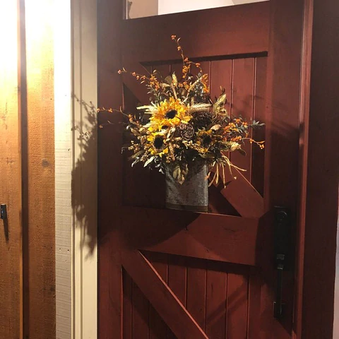 Ring in the new season with the best of fall farmhouse for your door, look no further! This custom created farmhouse basket is full of gorgeous sunflowers, pinecones, bittersweet and lush fall gatherings to complete this one of a kind basket.
