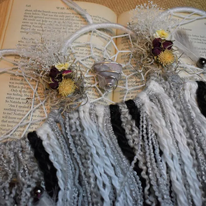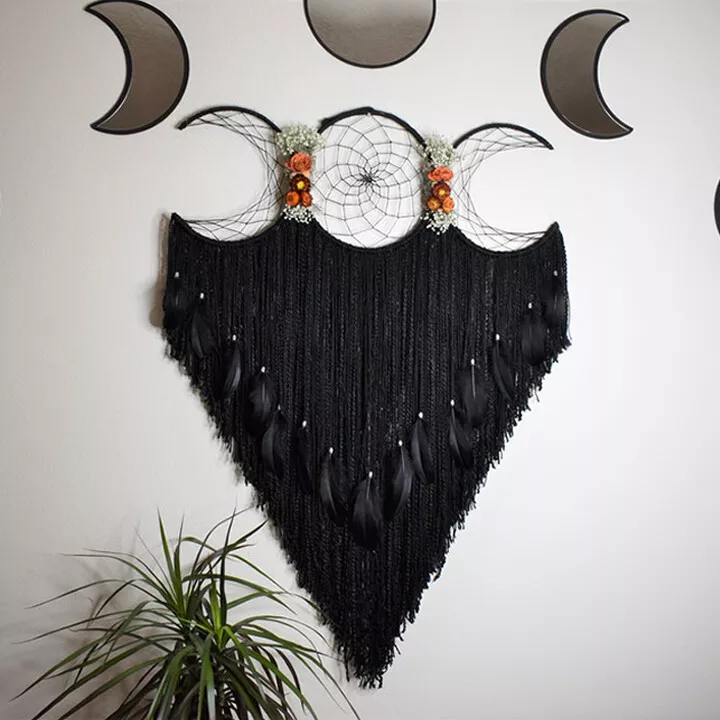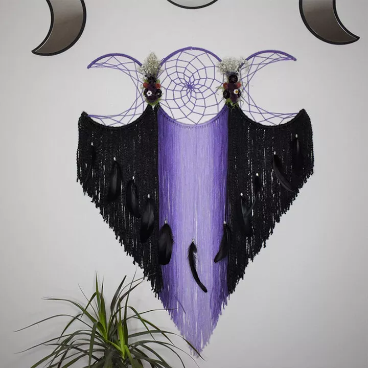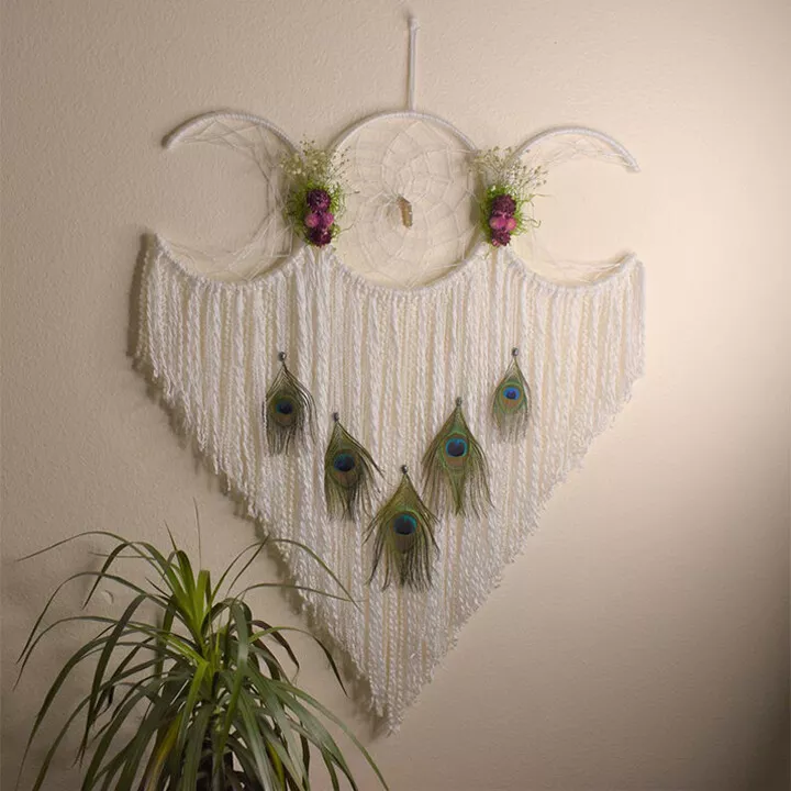 Each of the 3 moon phases are individually formed and hand wrapped with coordinated yarn. Then attached together forming the triple moon symbol. I then add gorgeous locally sourced and hand dried Flowers.