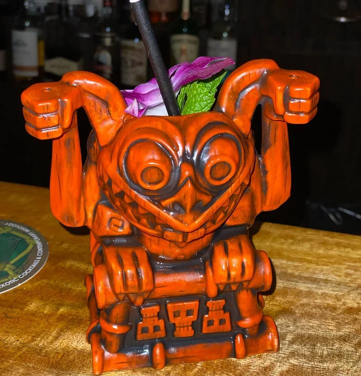 The wooden glaze recreates a classic carved tiki effect while keeping the familiar angles of our haunted friend. The top of his head is hollow and open to hold your favorite tiki drink and garnishes.![]()
