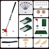 The mini golfing man indoor golf game comes with everything you'll need to get an extra-competitive game of indoor golf going, including two mini man shot makers attached to long poles to make it seem like you're really about to golf, Includes 12 clubs. One of them is left hand, a putting green, a tee box, 2 sand traps, 1 water hazard, 24 mini driving balls, a pin, and a cup.