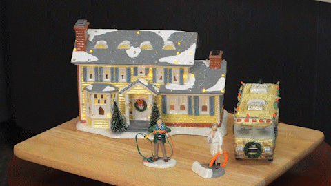 are carefully embedded in the ceramic to recreate Clark Griswold's master piece of Christmas illumination. Comes with a switch that allows the exterior lights to be on, off or twinkle. Inspired by the modern movie classic of the same name, enjoy lighted Village pieces and accessories that tell the story of the funniest Christmas vacation ever. Enjoy The Griswold Holiday House Snow Village piece adorning in your collection all winter long. The Griswold Family House in all it's Christmas glory adorned with Italian twinkles lights.![]()