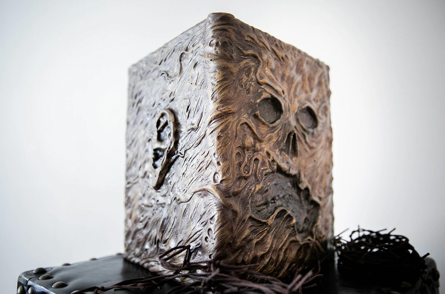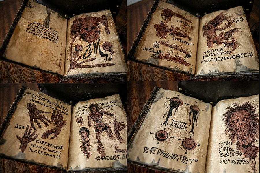 Antiquated book of macabre illustrations and unholy rituals (Aged paper) bound in demonic creature's face (latex). Wrapped in a bag with a barbed wire (non-metal).