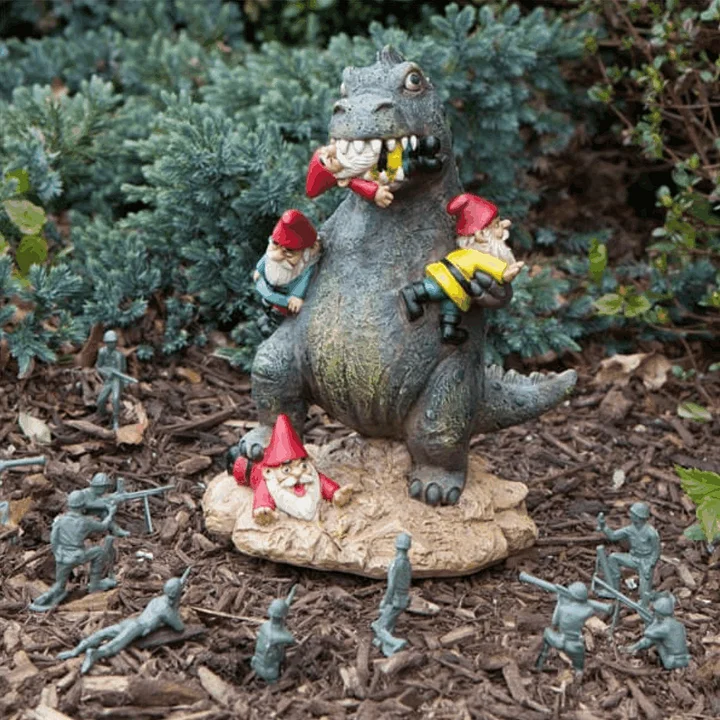 The Great Garden Gnome Massacre makes a great and hilarious gift for the garden lover in your life. The terrifying T-Rex is a defender of humanity with a taste for gnomes, a funny take on the conventional garden gnome. It’s a fun addition to any landscaping, but looks great in your home, garden or office, too. 12-inches tall; Made of durable cast poly resin to withstand the elements.