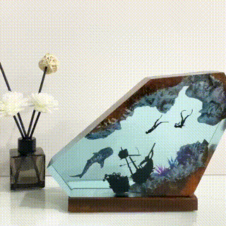 The resin wood art night light, Whale Shark and Couple diver night light, epoxy resin wood lamp, Scuba diving, Free diving, home decor Christmas gift, the light is shot in from the top.